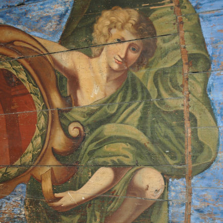 À l’origine, les trois grands caissons de la rangée médiane étaient ornés de scènes ou de personnages de tons ocres, les huit autres d’anges et de nuages de teintes bleues, alors que de simples motifs floraux étaient peints dans les dix petits caissons carrés, l’ensemble se détachant sur un fond brun décoré de feuillages bleus.